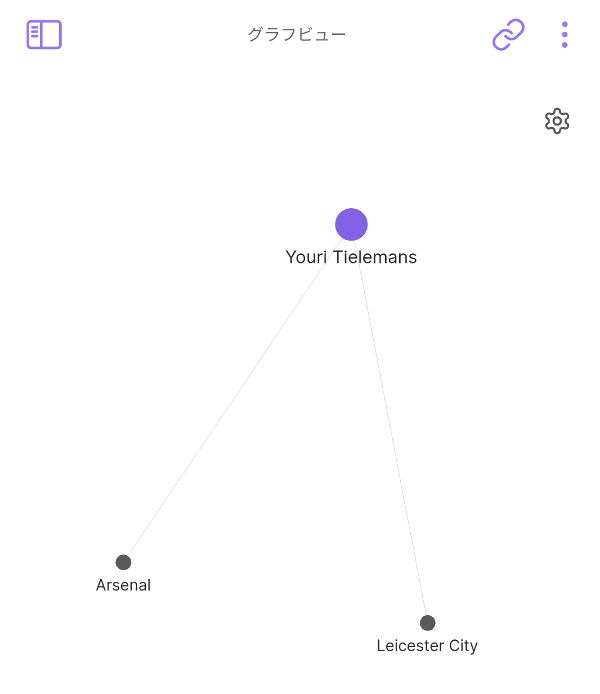 例えばYouri Tielemansというメモを以下の内容で作成したとします。[[  ]]は別のメモを参照する内部リンクで、この例だとArsenalとLester Cityというメモへのリンクを貼っていることになります。この状態でGraph viewを起動してみると…